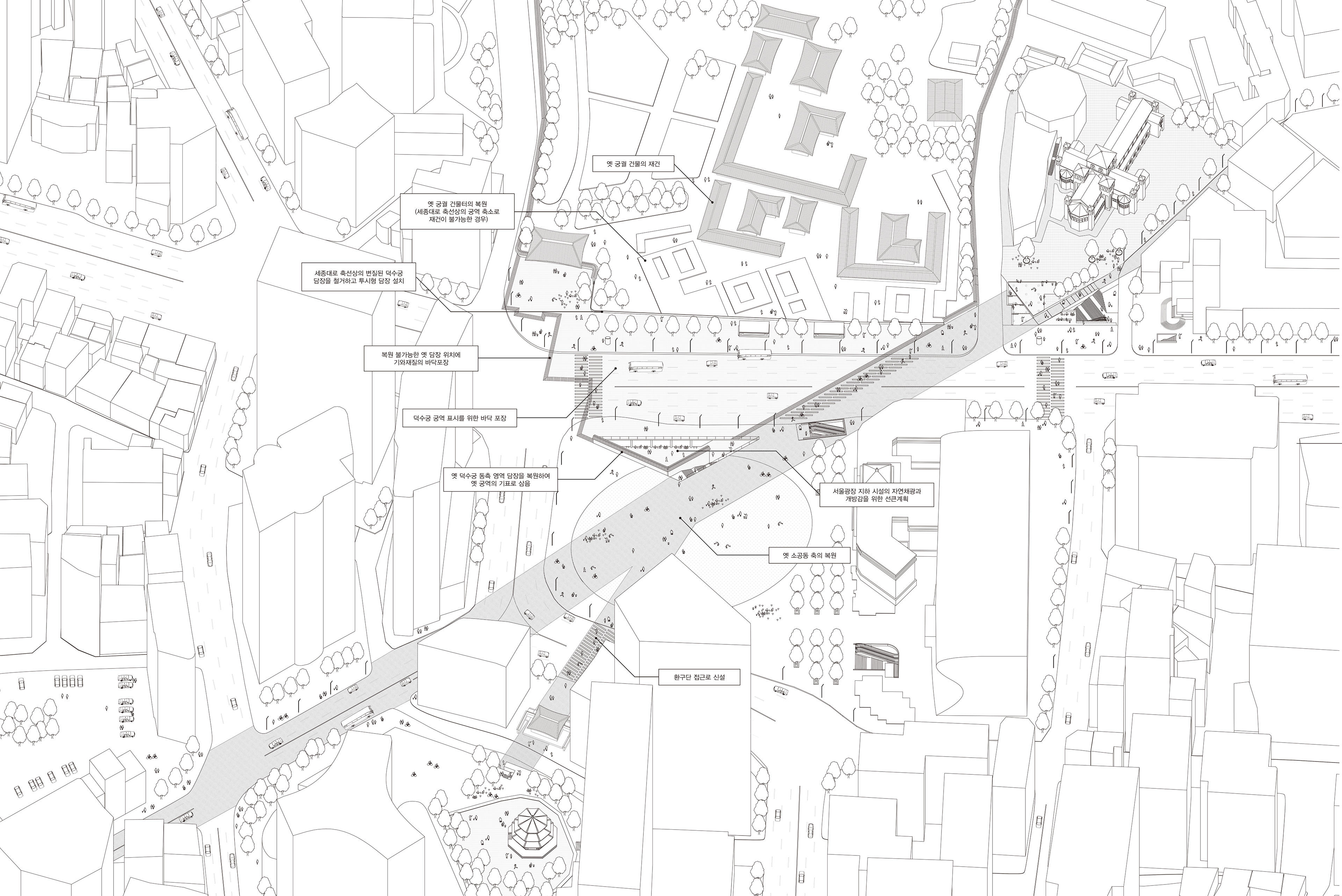 세종대로 역사문화공간 계획안 Client: Seoul Metropolitan City Location: Junggu, Seoul Principal use: Cultural facility Site area: 1,088 sqm. Floor area: 2,502 sqm. Collaboration: Parti Studio Year: 2015